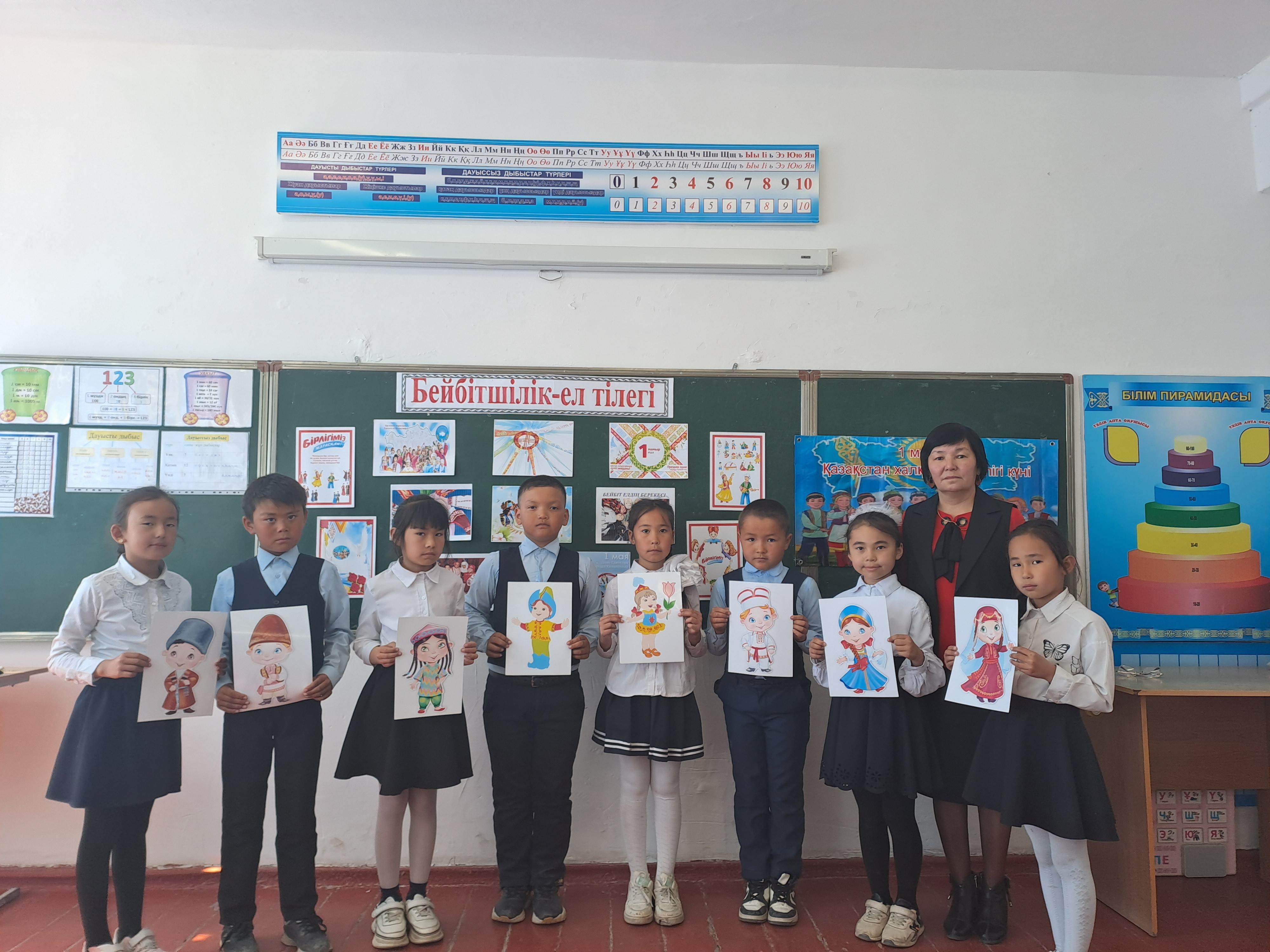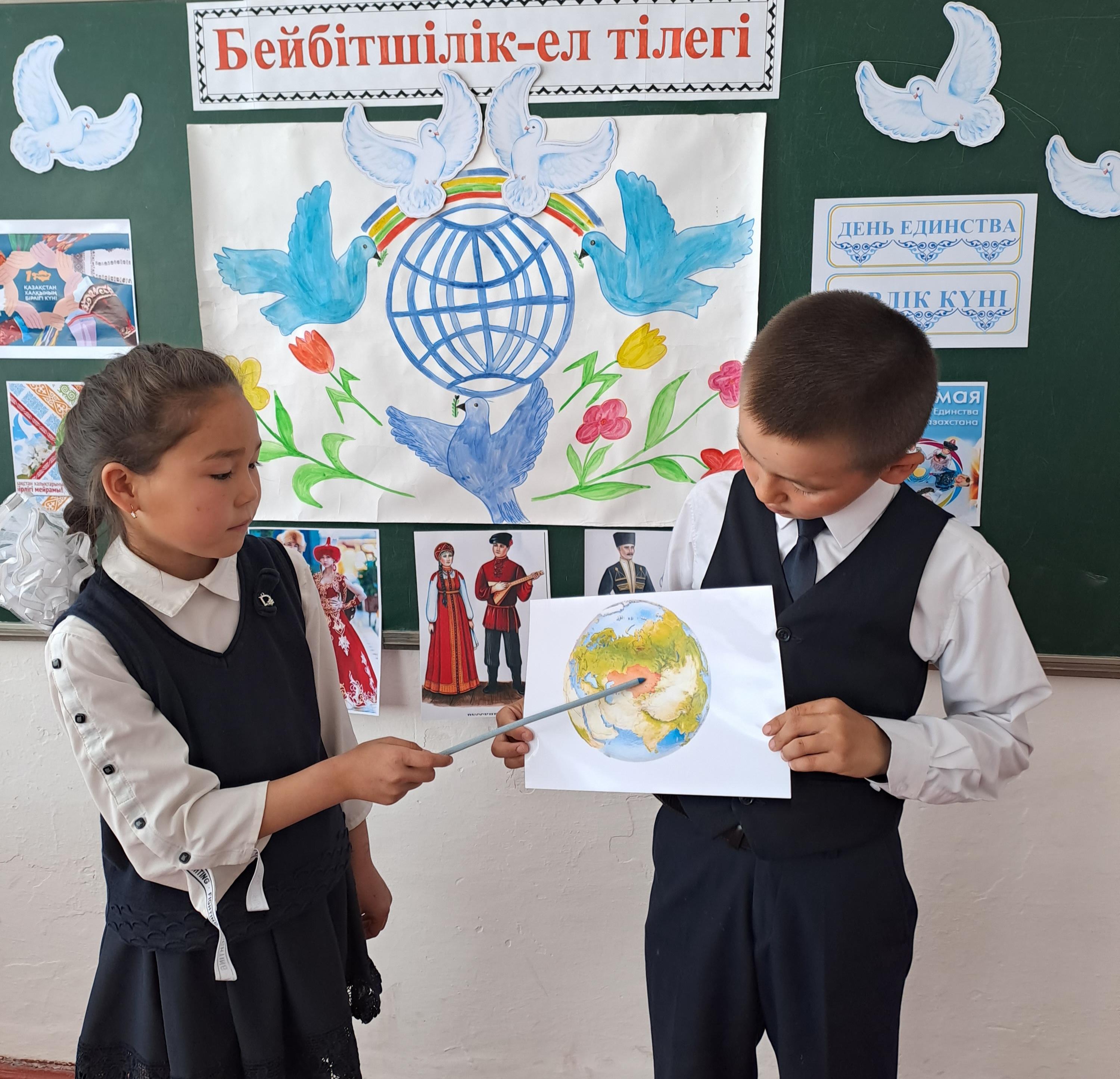 1 мамыр- Қазақстан халқының бірлігі күніне орай 1-11 сыныптар арасында «Бейбітшілік- ел тілегі» сынып сағаттары өтілді.Мақсаты:1 - мамыр Қазақстан халықтар бірлігі күні екенін оқушыларға жеткізу; Ынтымақтыққа, достыққа, өз Отанын сүюге, қорғауға тәрбиелеу. Біздің елімізде тұрып жатқан басқа да халықтардың озық мәдениетін, өзіндік үлгі - өнегесін оқушылардың бойына сіңіру.